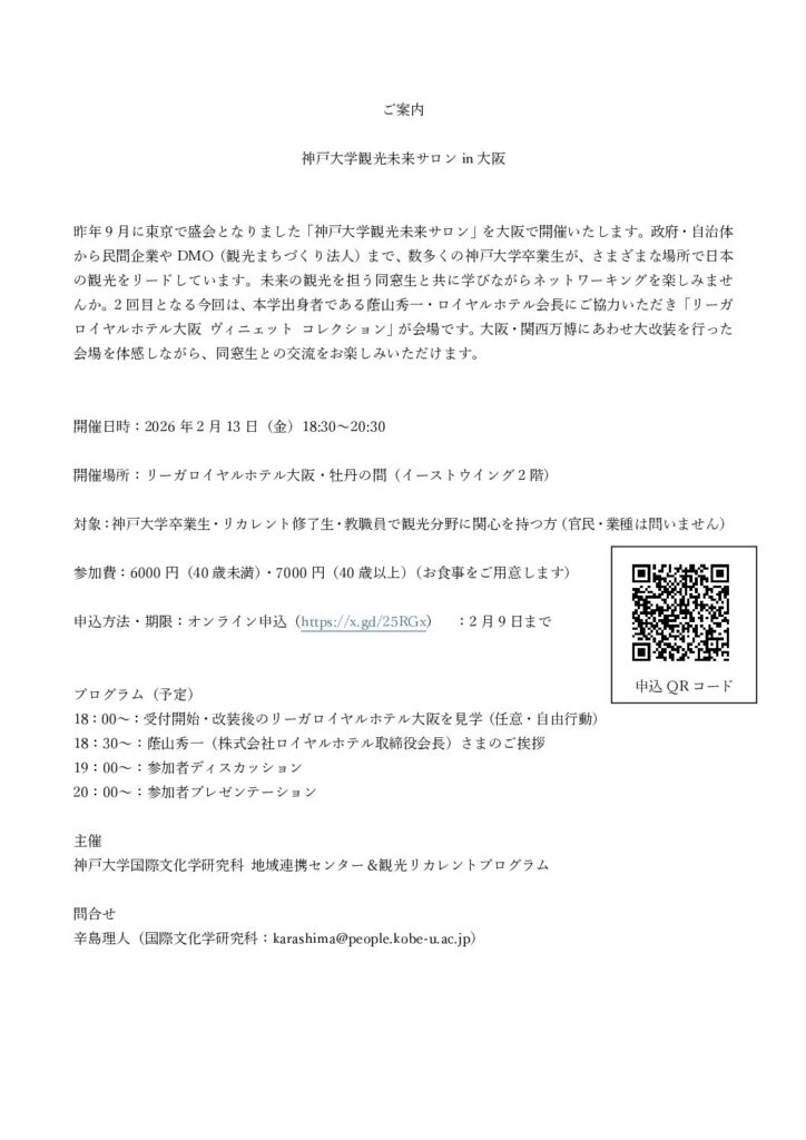2026/2/13(金)開催・神戸大学 Promis 地域連携センター「神戸大学観光未来サロンin大阪」